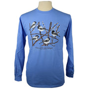 This delightful shirt shows a small flock of black-capped chickadees resting on branches with winter buds accompanied by a playful take on their call.