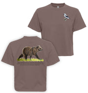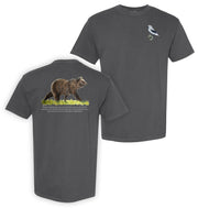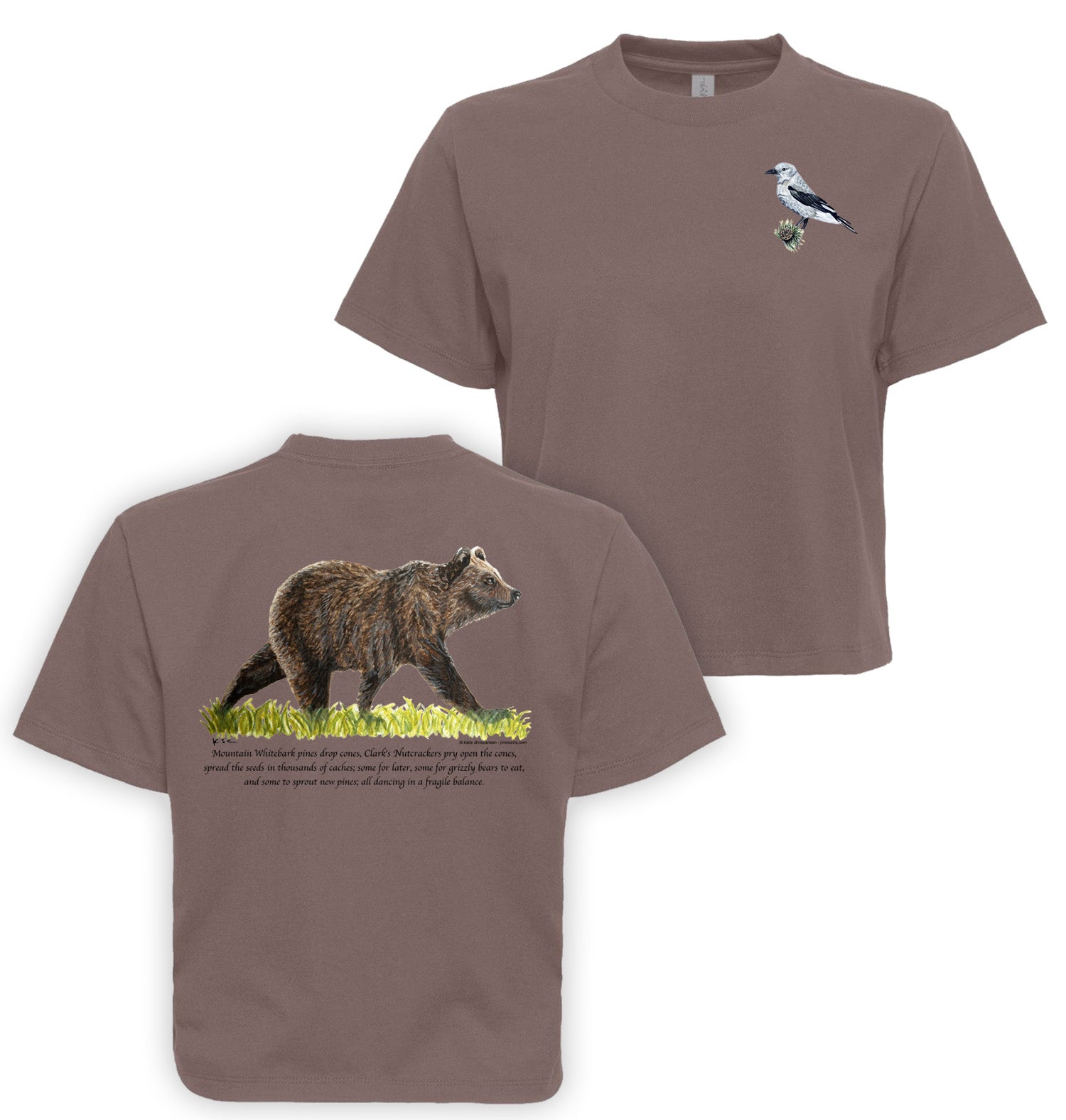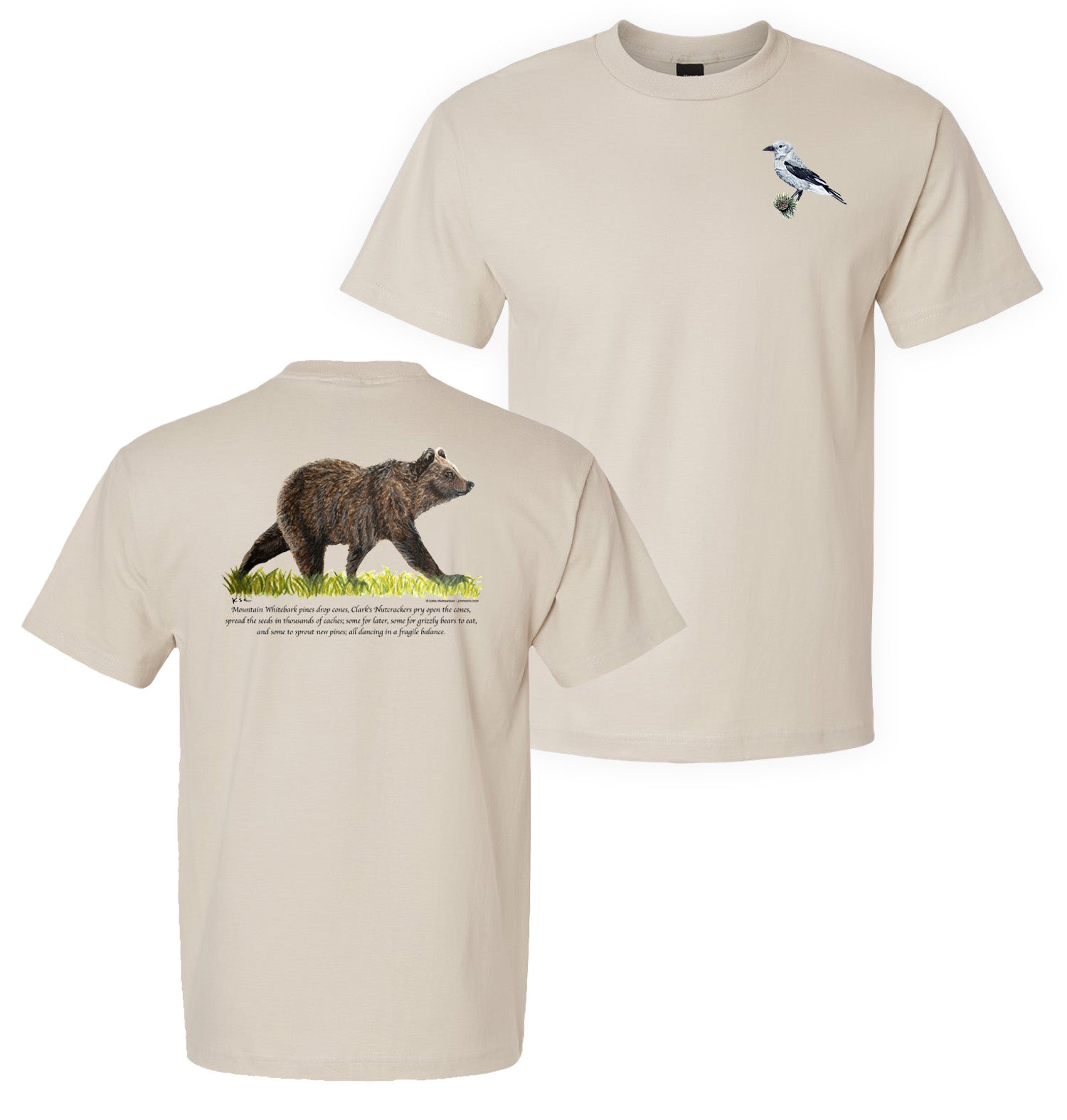 Tee featuring a Clark's nutcracker on the front chest and a grizzly bear on the back . The text on the back describes the interconnectedness of wildlife and nature - between Mountain Whitebark pine trees, grizzly bears and Clark's nutcrackers.
