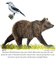 The back text reads: "Mountain Whitebark pines drop cones, Clark's Nutcrackers pry open the cones, spread the seeds in thousands of caches; some for later, some for grizzly bears to eat, and some to sprout new pines; all dancing in a fragile balance."