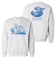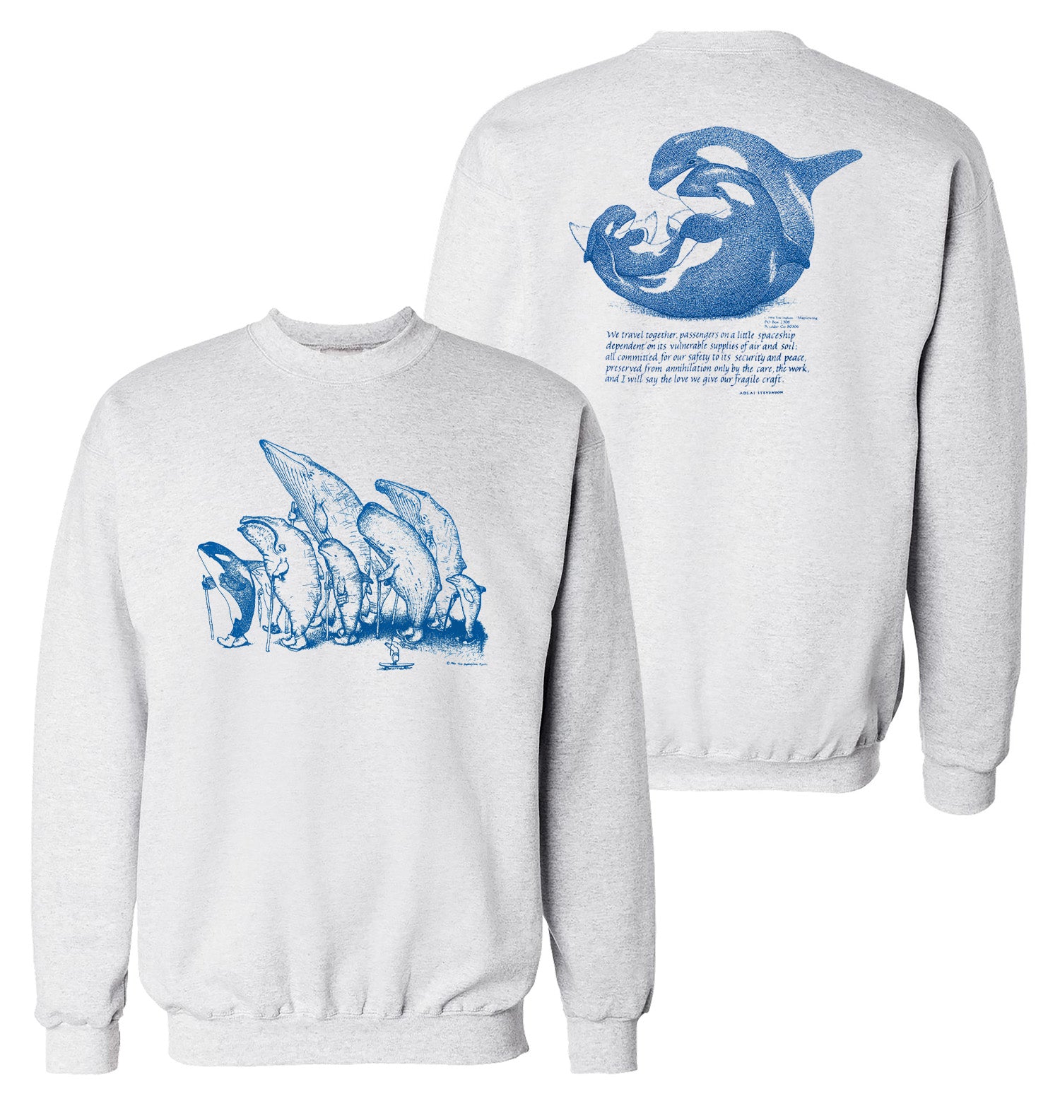 As the title suggests, this design depicts a diverse pod of whales marching with walking sticks. A skateboarding clam holds a little flag with its foot in the foreground. The back presents an orca whale couple cradling their calf followed by a quote from the late progressive politician Adlai Stevenson, "We travel together, passengers on a little spaceship dependent on its vulnerable supplies of air and soil; all committed for our safety to its security and peace, preserved from annihilation only by the care, the work, and I will say the love we give our fragile craft."
