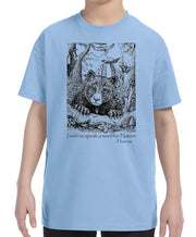 People can help black bears by advocating for habitat conservation and ensuring that compost heaps and other refuse disposal sites are bear-proofed; this is required by law in many Western municipalities. This shirt depicts a black bear in a beautiful landscape accompanied by a quote from Henry David Thoreau, "I wish to speak a word for nature," reminding us to speak up for nature and do our best to advocate for conservation and the protection of our natural resources.