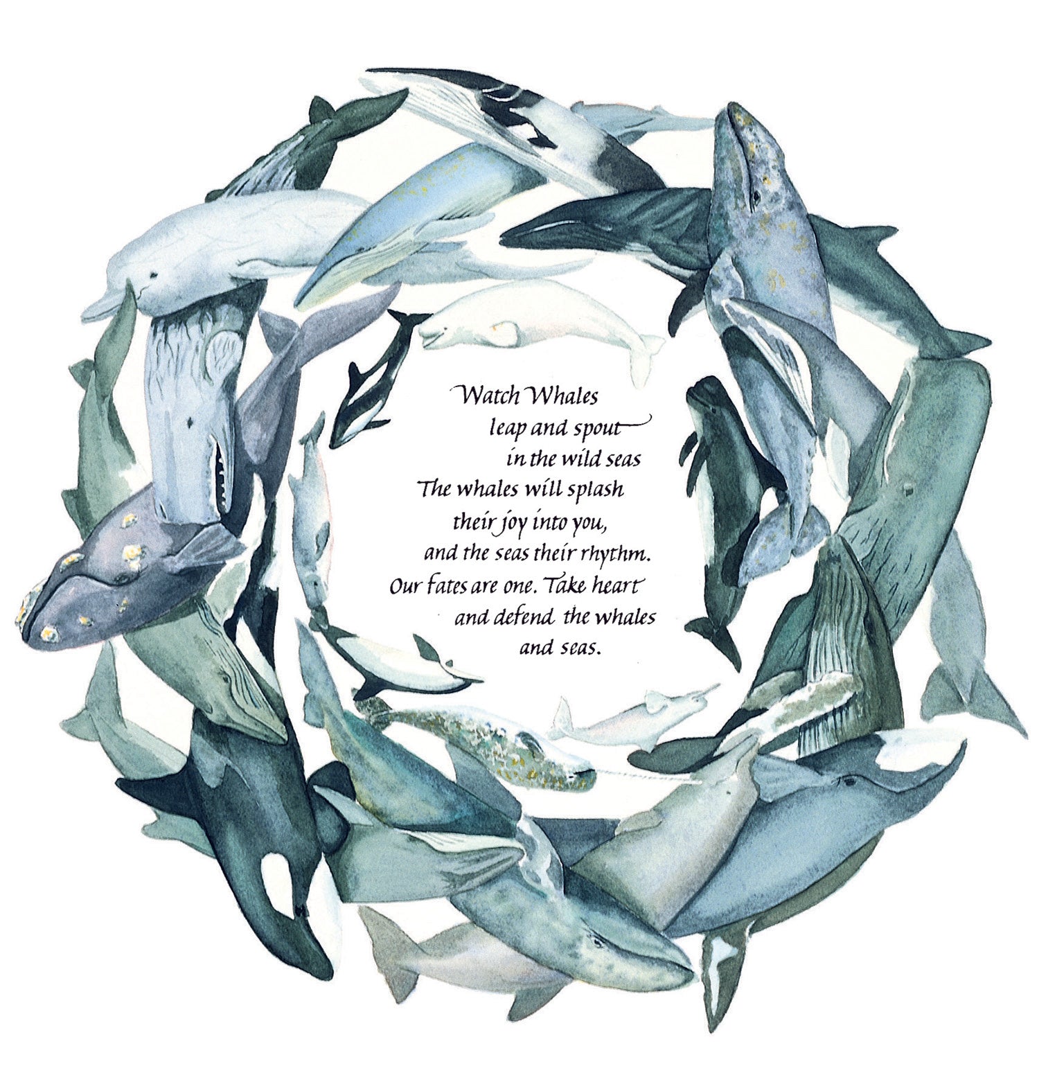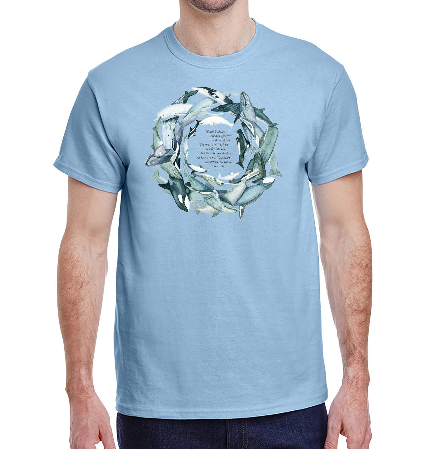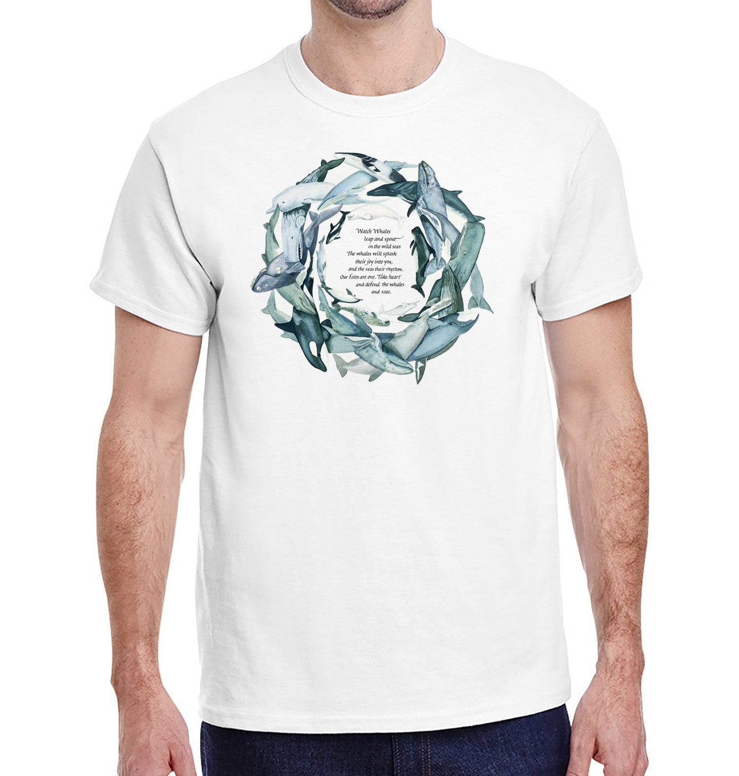 Show your love for whales and commitment to their continued conservation and protection with this beautiful shirt. A poem within the circle of whales reads, "Watch Whales leap and spout in the wild seas. The whales will splash their joy into you, and the seas their rhythm. Our fates are one. Take heart and defend the whales and seas."