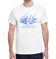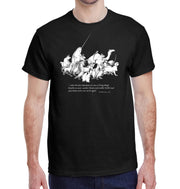 A variety of creatures, both real and mythical, march together on this shirt. A sphinx leads the pack, followed by such creatures as a two-headed eagle, a Minotaur, and a griffon, accompanied by more commonplace animals such as a camel, a narwhal, an ibex, an alpaca, a lion with a crown on his head... the list goes on. This caravan of creatures is depicted above a quote: