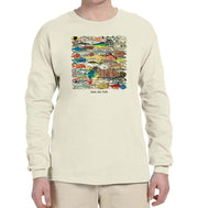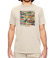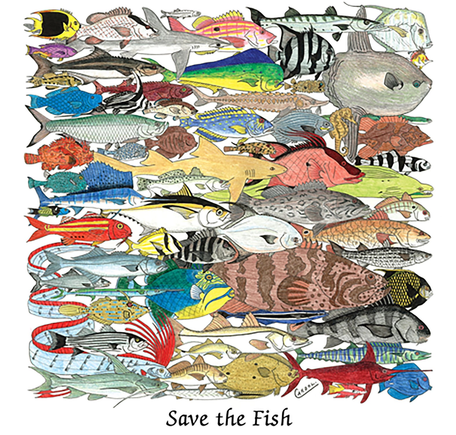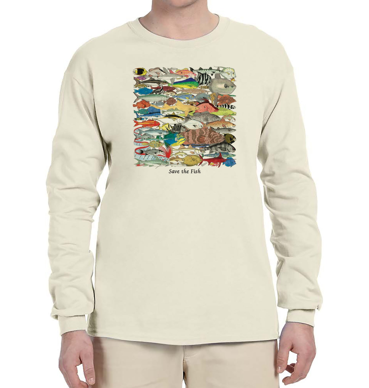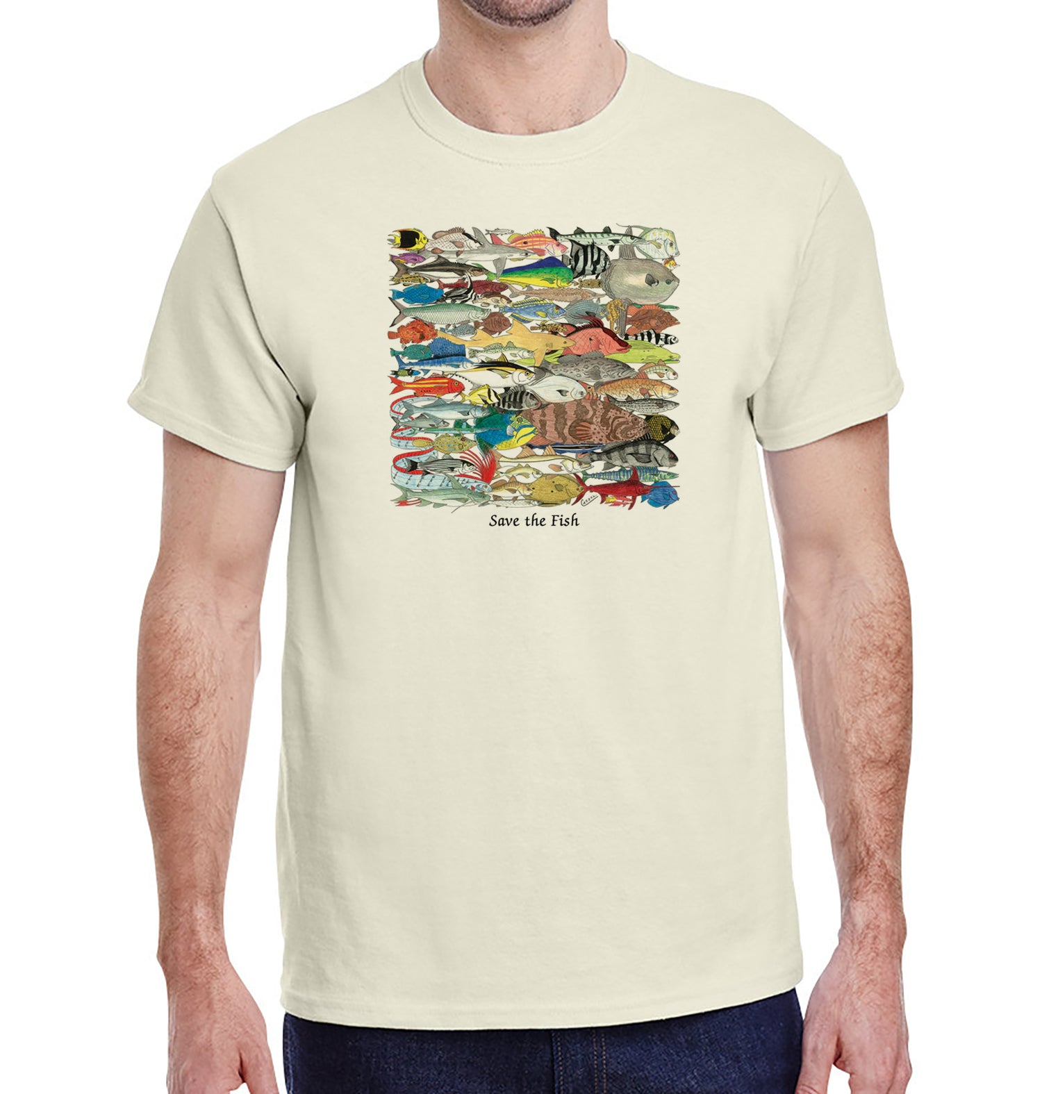 This colorful shirt depicts around 100 species of fish, the most diverse group of vertebrates. This diversity is under threat from pollution, development of waterways, introduced species, climate change, and overfishing. The estuaries at the mouths of large rivers, once hotspots of biomass and biodiversity, are being poisoned by pollution from industry and choked by algae blooms fueled by nutrient-rich agricultural runoff.