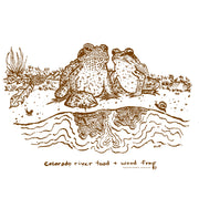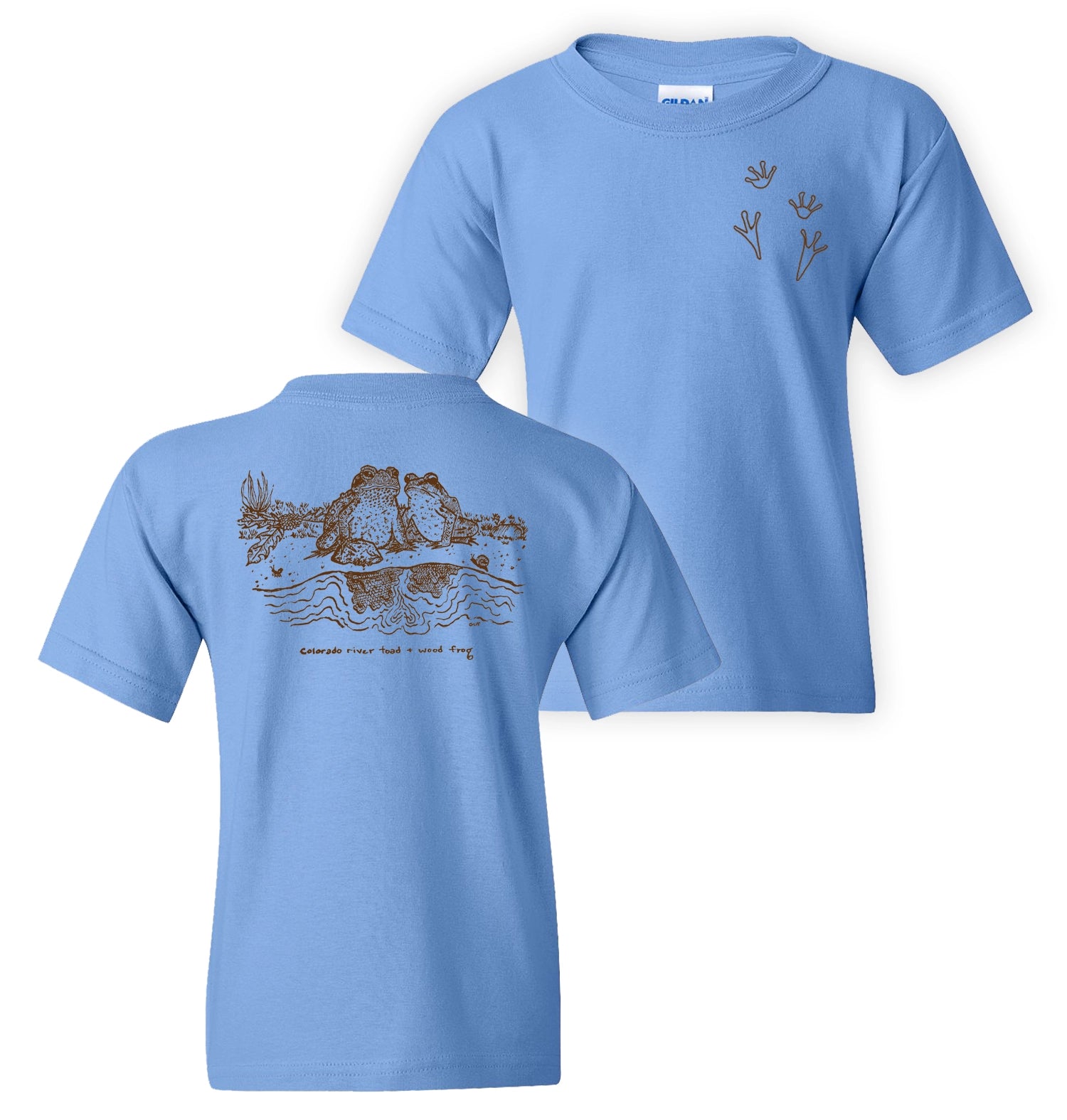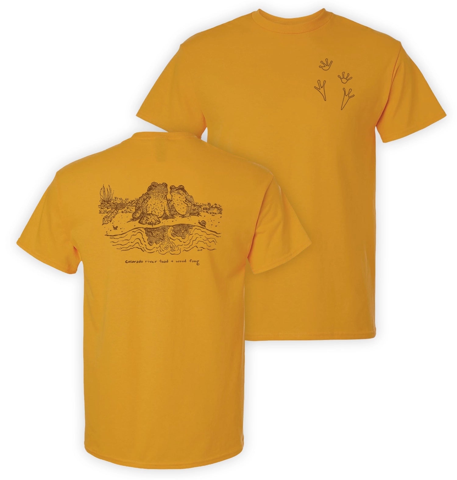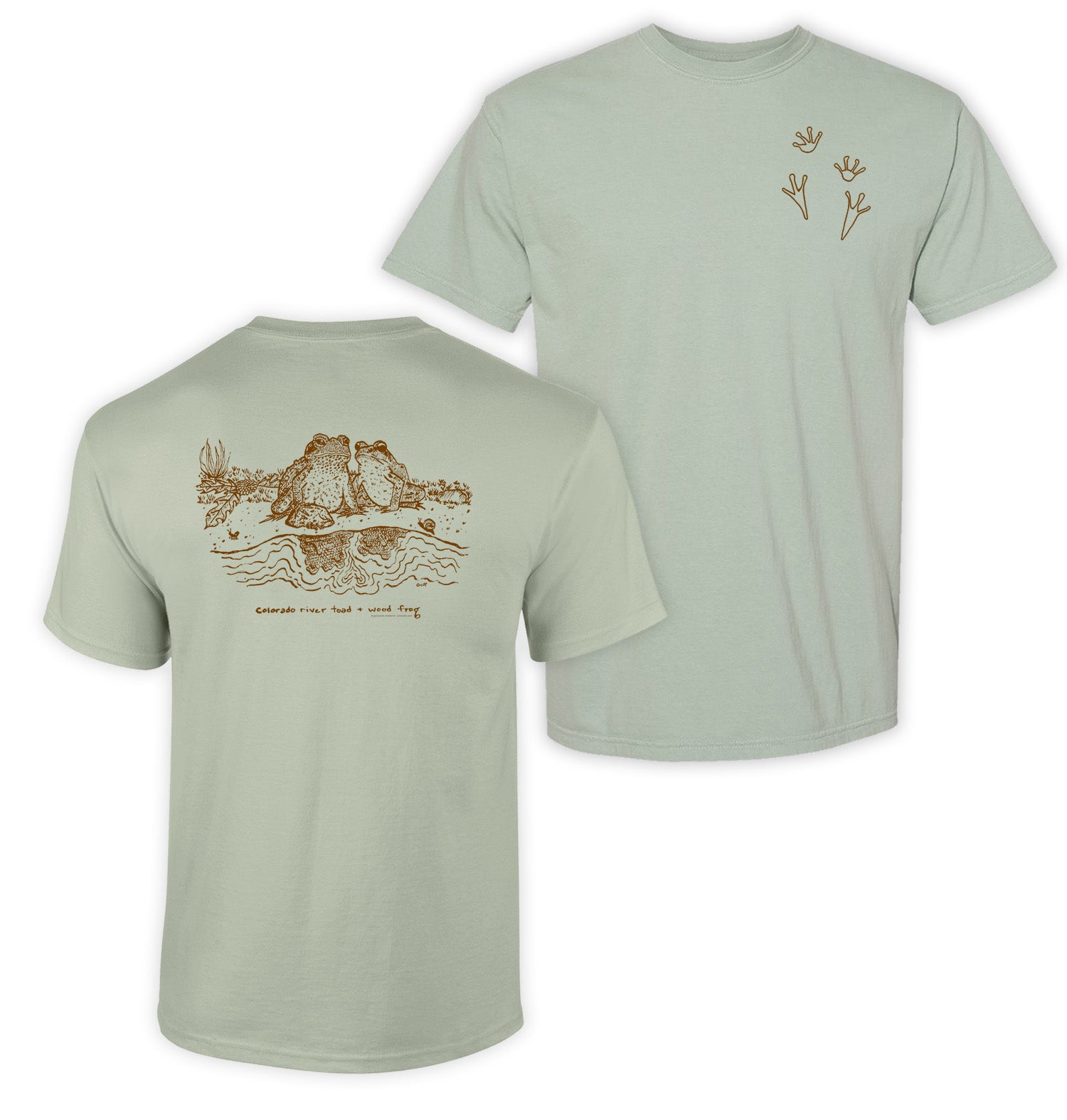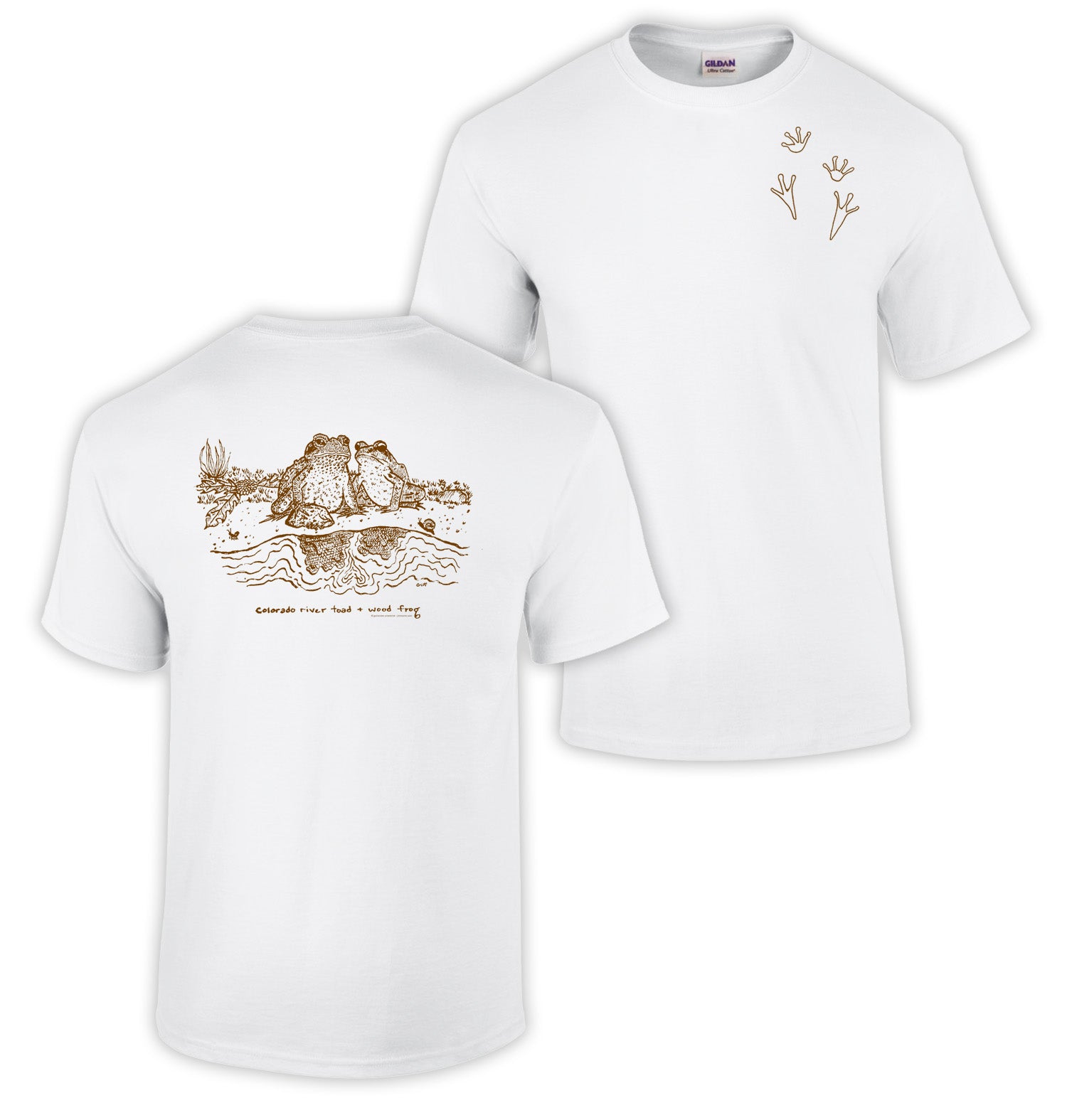 -Frog and toad printed on back of shirt, frog tracks printed on front left chest