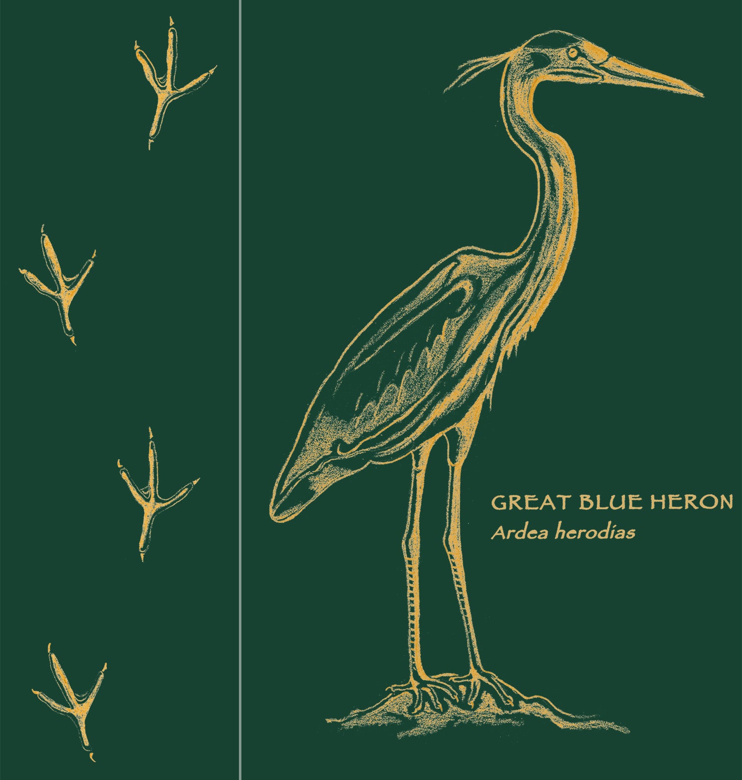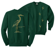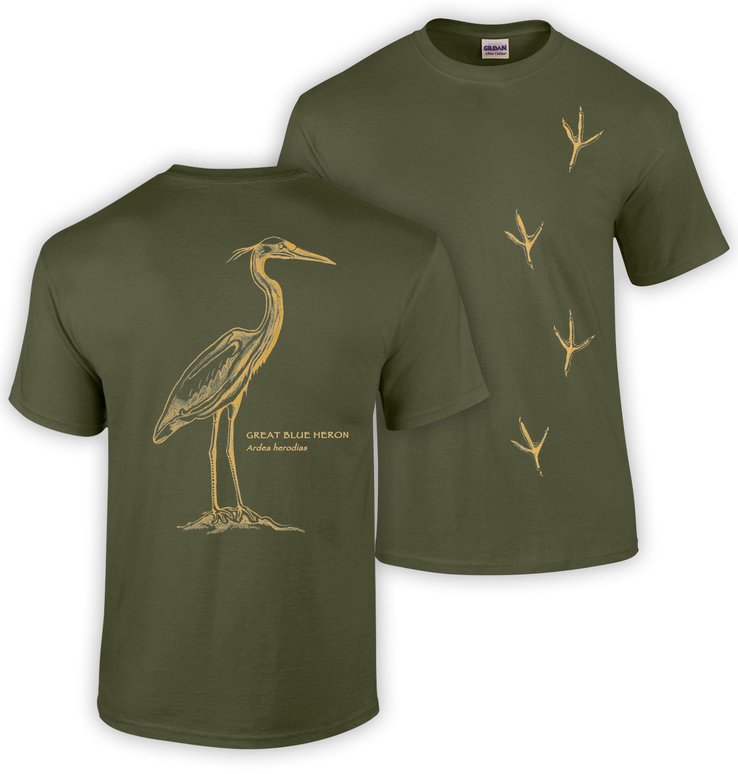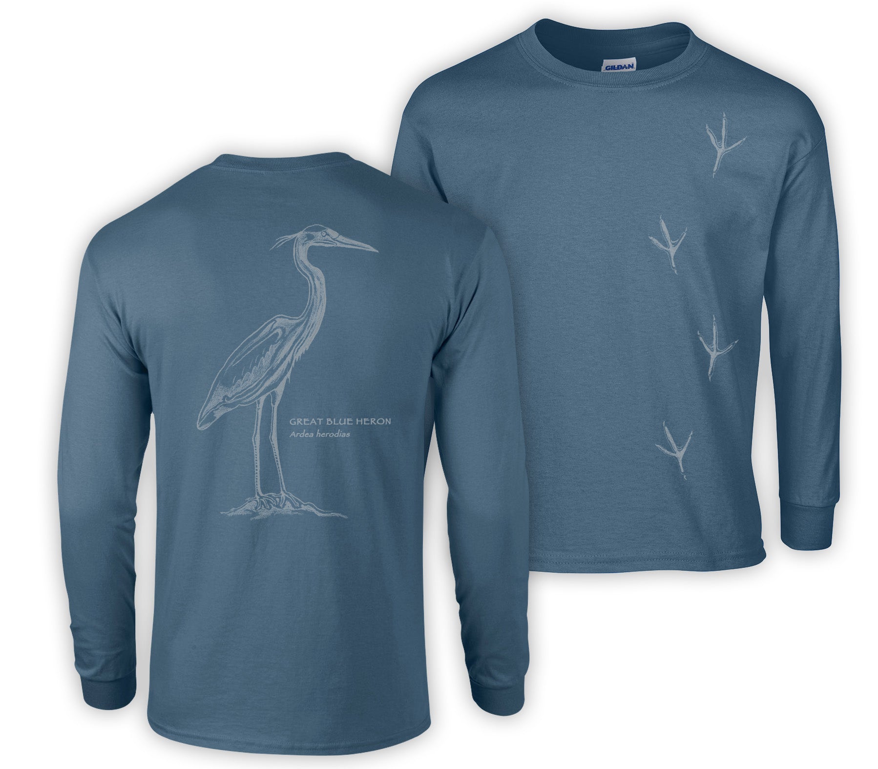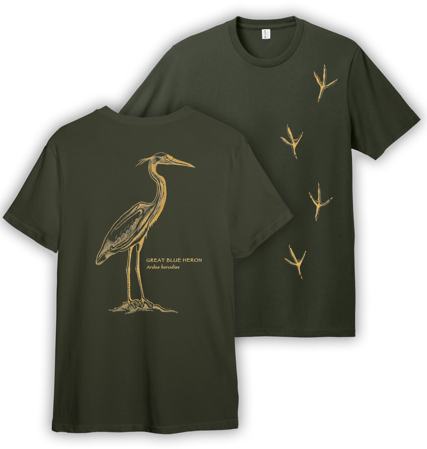 You can help to protect these graceful animals by advocating for strong regulation of agricultural chemicals and industrial waste disposal and conservation of important wetland habitat. The front of this shirt shows heron tracks in field guide format, and the back is printed with a beautiful monochrome great blue heron with its Latin name.