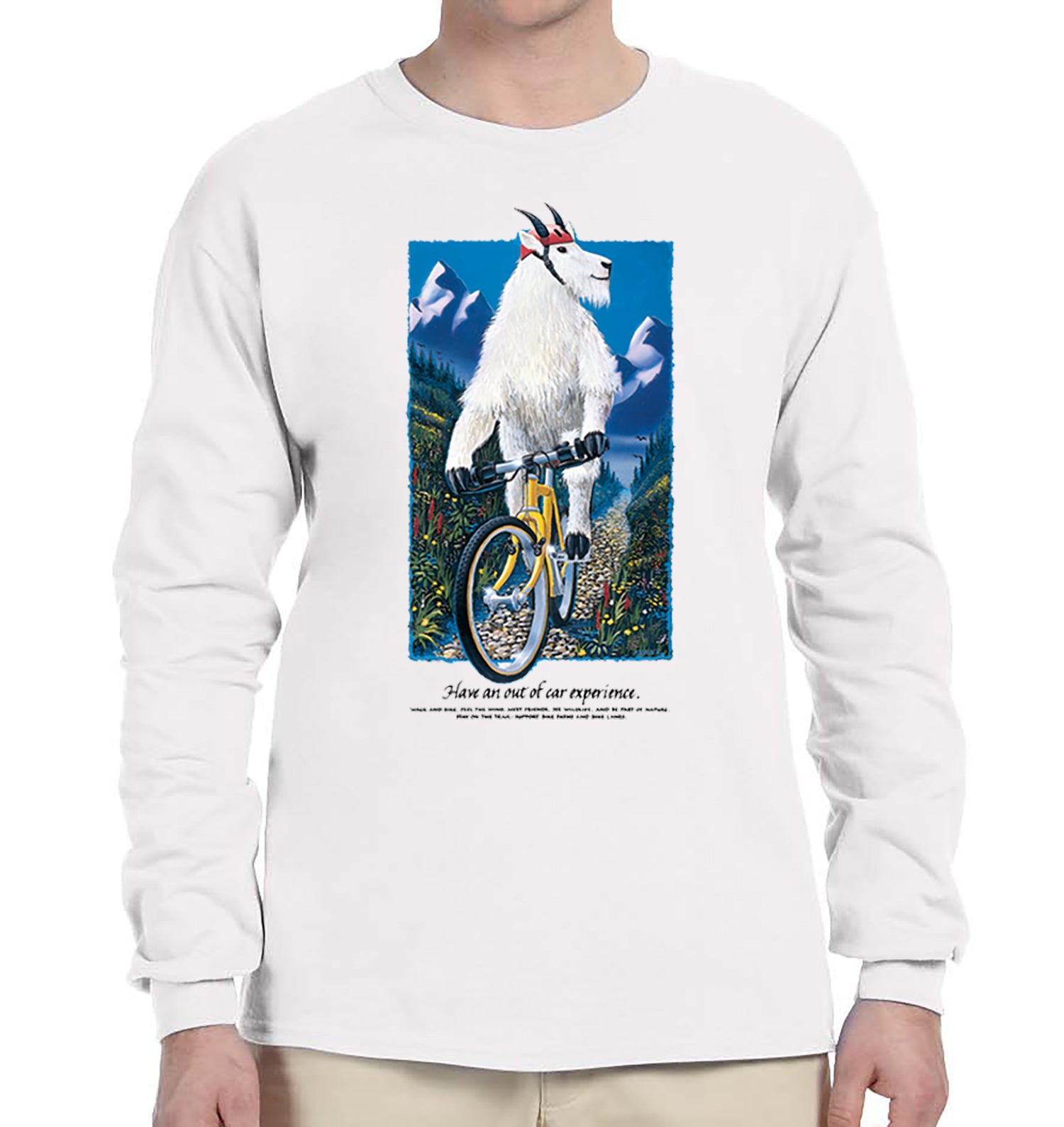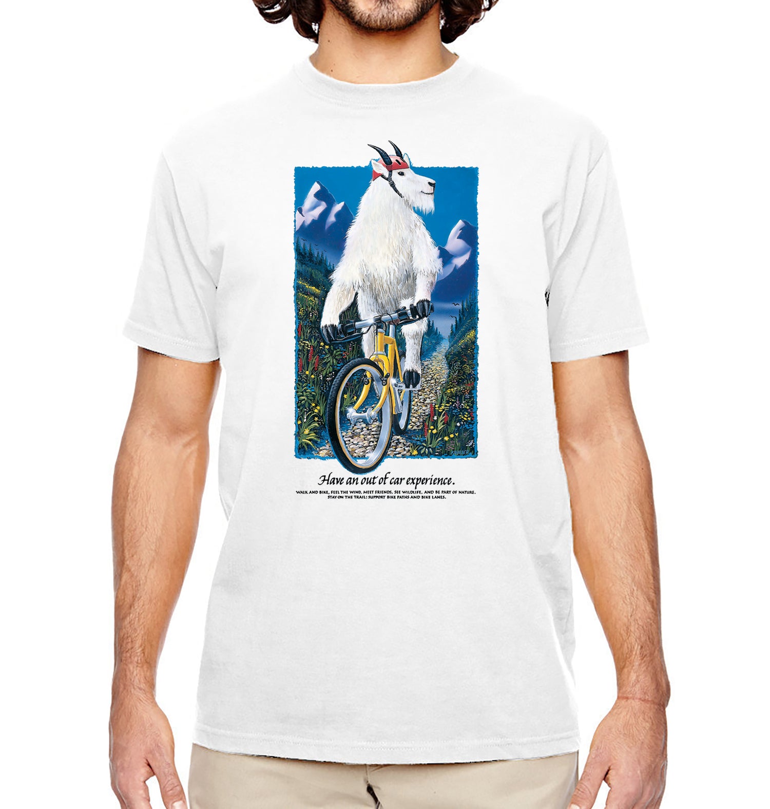 A mountain goat rides a mountain bike through an upland meadow full of wildflowers on this fun shirt. Mountain goats are perfectly adapted to life at high elevations in the Western Cordillera of North America, with a double coat of wool that keeps them warm down to -50° F and a knack for navigating impossibly steep terrain.