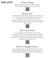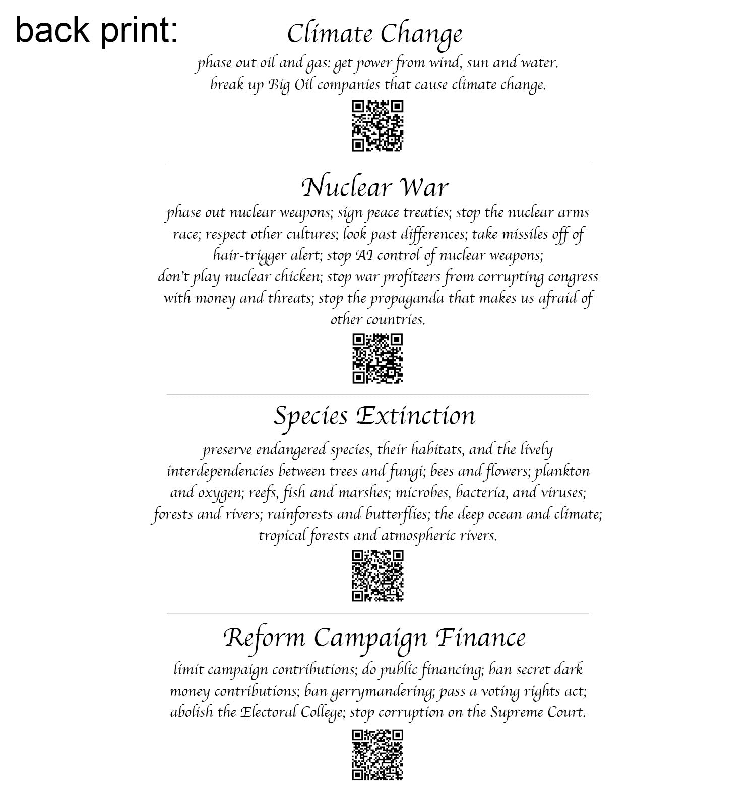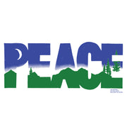 The front of this shirt features the word "PEACE" filled with a mountain landscape scene. The back features information about how how humanity can move towards peace in the world, with QR codes that link to Jim's blog posts about the topics.