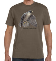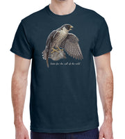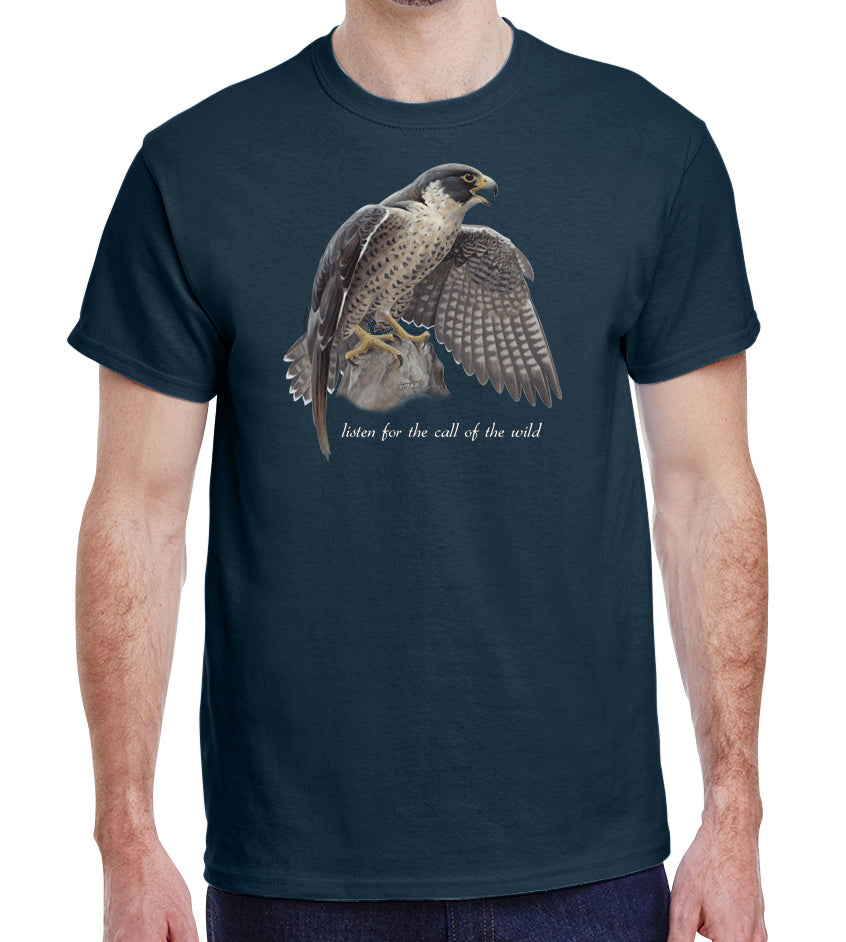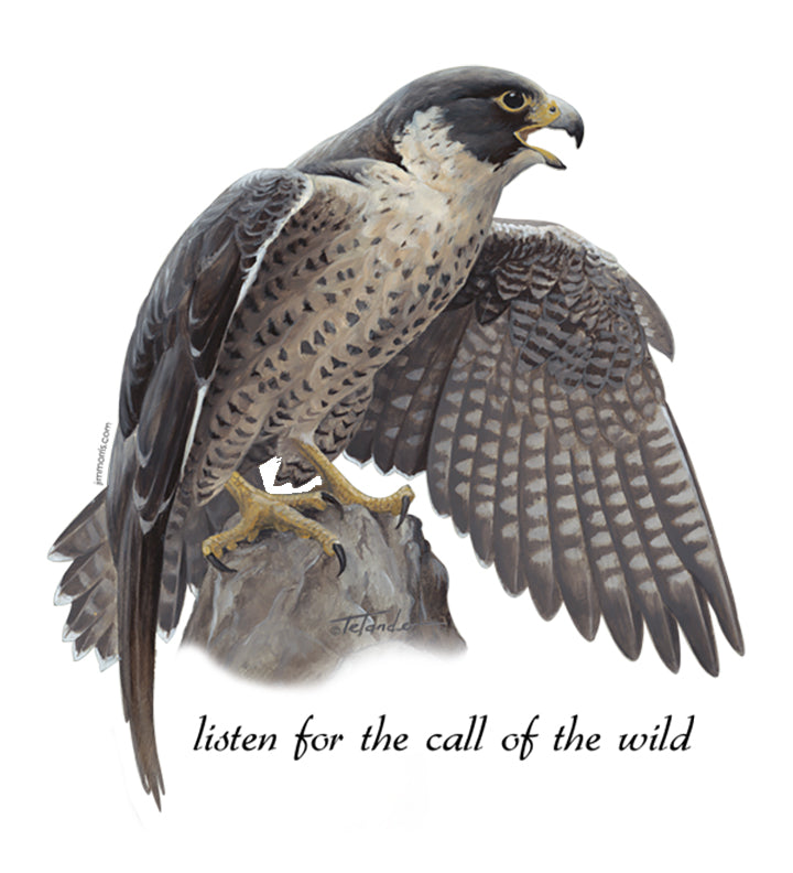 "Listen for the call of the wild." Peregrine falcons are the fastest animals on earth, capable of flying over 200 mph, and have the largest natural range of all bird species, occurring everywhere but the Greenland and Antarctic ice sheets, the Amazon Rain Forest, the Tibetan Plateau, and the Sahara, Arabian, and Kalahari deserts. Peregrines have a long legacy of cohabitation with humans, having been used in falconry to aid in hunts for millennia. The pesticide DDT demolished global raptor populations, but Peregrine Falcon populations have rebounded splendidly since DDT was banned in the 1970s. They have adapted exceptionally well to urban environments, nesting on tall buildings and preying on pigeons, ducks, and other urban birds. Peregrines symbolize speed, strength, and the ability of wildlife to rebound when protected from pesticides and pollution.