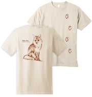 Red fox tracks mark the front of this shirt, while a fox sits on the back with its common and scientific name. The red fox is distributed across the Northern Hemisphere excluding the Mohave desert and the American Great Basin, where its niche is filled by the fennec fox and kit fox respectively. They tend to dominate other species in their range; the range of the arctic fox is limited on the south by the northern extent of the larger red foxes. They live in small family groups, with adolescents staying on with their parents to assist in care of new litters, and eat fruits and prey on many kinds of small animals.