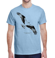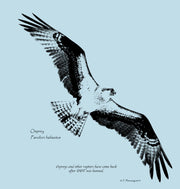 A soaring osprey is depicted from below with its common and scientific names and the phrase "Ospreys and other raptors have come back after DDT was banned" on this wildlife t-shirt.
